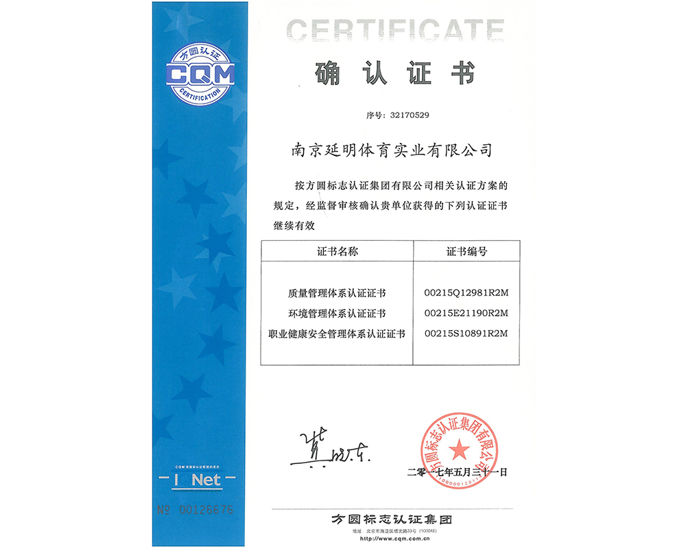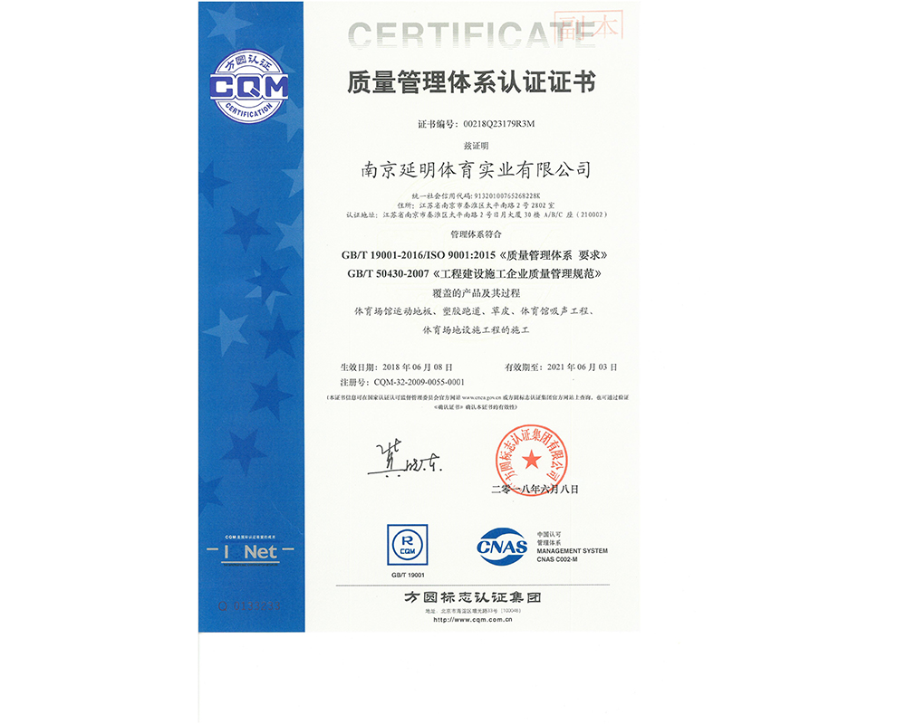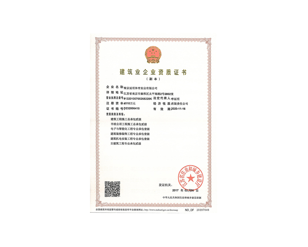 作為江蘇省體育產(chǎn)業(yè)示范單位,延明體育擁有多年相關(guān)工程總承包施工經(jīng)驗(yàn),取得建筑工程施工總承包二級(jí)、古建筑工程專業(yè)承包二級(jí)、建筑裝修裝飾工程專業(yè)承包一級(jí)、電子與智能化工程專業(yè)承包一級(jí)、市政公用工程施工總承包二級(jí)資質(zhì);通過(guò)ISO 9001:2015質(zhì)量管理體系認(rèn)證;通過(guò)ISO14001:2015環(huán)境管理體系認(rèn)證;通過(guò)IOS45001:2018職業(yè)健康安全管理體系認(rèn)證。
